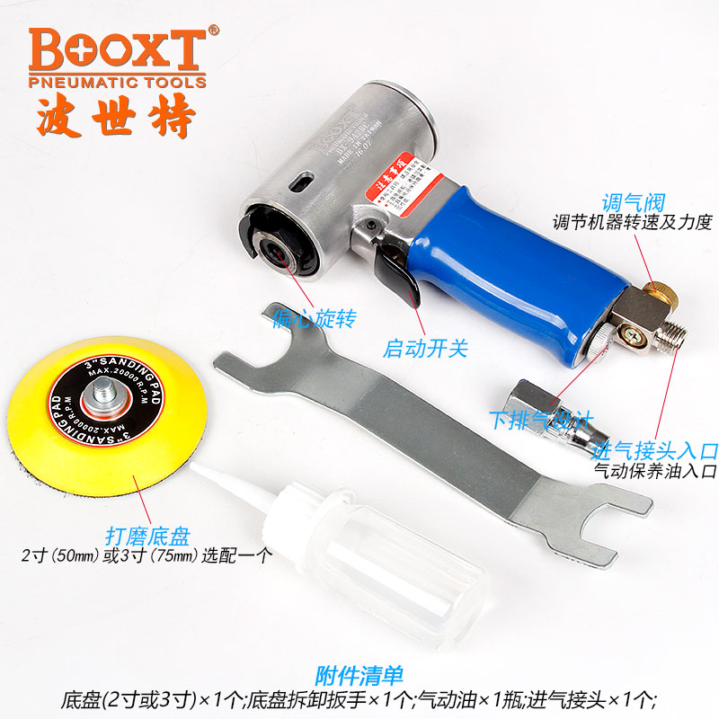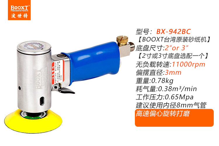 • 產(chǎn)品參數(shù): 底盤尺寸:50/75mm(M8螺牙托盤)【2/3寸】 偏擺直徑:3mm 空載轉(zhuǎn)速:11000rpm 工具全長(zhǎng):172mm 重 量:0.78kg 耗 氣 量:0.38m3/min 【工業(yè)型/帶偏心】