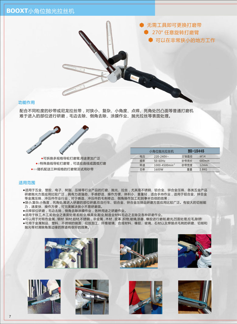 1)使用不同砂粒的砂帶或尼龍拉絲帶,對狹小、復雜、焊縫、點焊、小角度、死角處凹凸面等普通打磨機無法進入的部位進行研磨、打磨、拋光、拉絲、倒角、去毛刺、涂膜作業(yè)等表面處理作業(yè)。