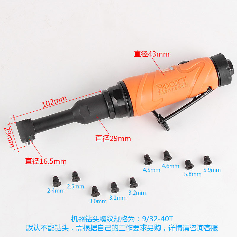 • 產(chǎn)品參數(shù): 夾頭螺牙:9/32"*40T 空載轉(zhuǎn)速:3600rpm 馬達(dá)功率:0.5HP 全 長:258mm 重 量:0.86kg 耗 氣 量:99L/min