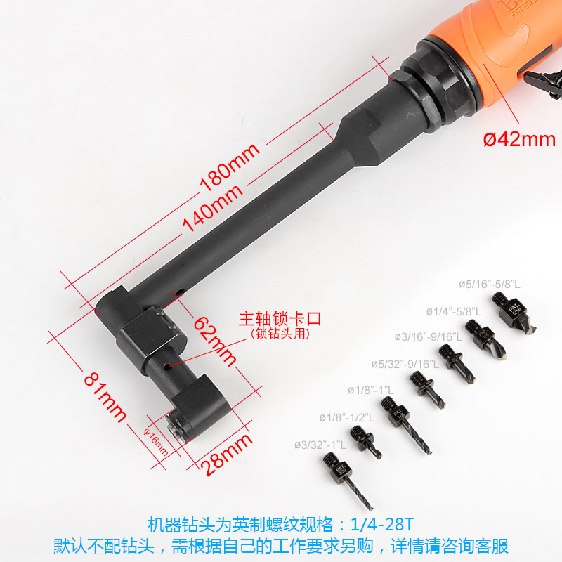 • 產(chǎn)品參數(shù): 夾頭螺牙:1/4"*28T 空載轉(zhuǎn)速:3600rpm 馬達功率:0.5HP 全 長:345mm 重 量:1.06kg 耗 氣 量:99L/min (加長型)