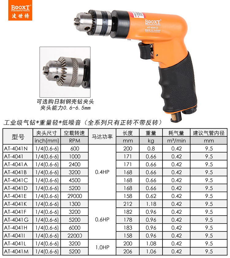 東莞市強(qiáng)勁五金工具有限公司提供臺灣BOOXT波世特品牌氣動工具,1000轉(zhuǎn)小型氣動鉆AT-4041廠家直銷,首件享特價。咨詢熱線:4008301980