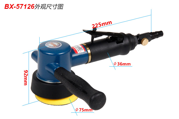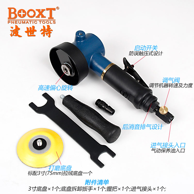 • 產(chǎn)品參數(shù): 底盤尺寸:75mm 【3寸】 偏擺直徑:14mm 空載轉(zhuǎn)速:11000rpm 工具全長(zhǎng):225mm 重 量:1.1kg 耗 氣 量:0.25m3/min 【工業(yè)型/帶偏心】