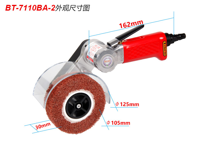• 產(chǎn)品參數(shù): 拉絲輪尺寸:30*105mm 空載轉(zhuǎn)速:7000rpm; 工具長(zhǎng)度:162mm; 工具重量:1.05kg; 馬達(dá)功率:0.5HP; 耗 氣 量:0.65m3/min; 使用工作氣壓:0.65Mpa; 推薦使用內(nèi)徑8mm氣管; 平時(shí)使用應(yīng)多加氣動(dòng)油保養(yǎng). 【經(jīng)濟(jì)型】