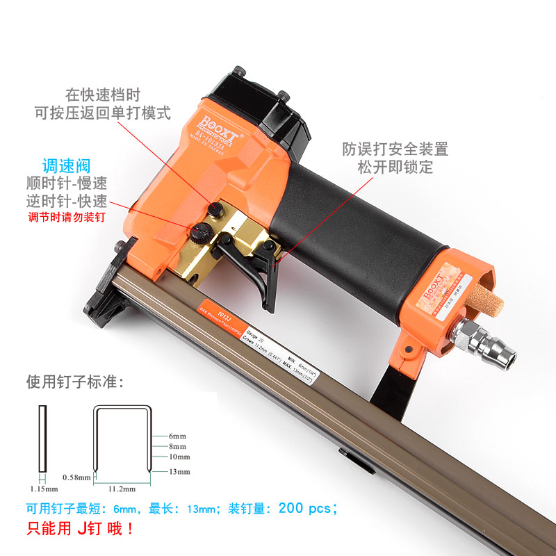 • 產(chǎn)品參數(shù): 特點(diǎn):可調(diào)節(jié)快速連打,自帶防誤打安全開關(guān);釘子寬度:11.2mm;釘子跨度:10mm;釘腳尺寸:0.58×1.15mm;使用釘子長度范圍:6-13mm;裝釘量:200個(gè);使用工作氣壓:0.6Mpa;推薦使用內(nèi)徑6.5mm氣管;平時(shí)多注意定時(shí)排放空壓機(jī)水份