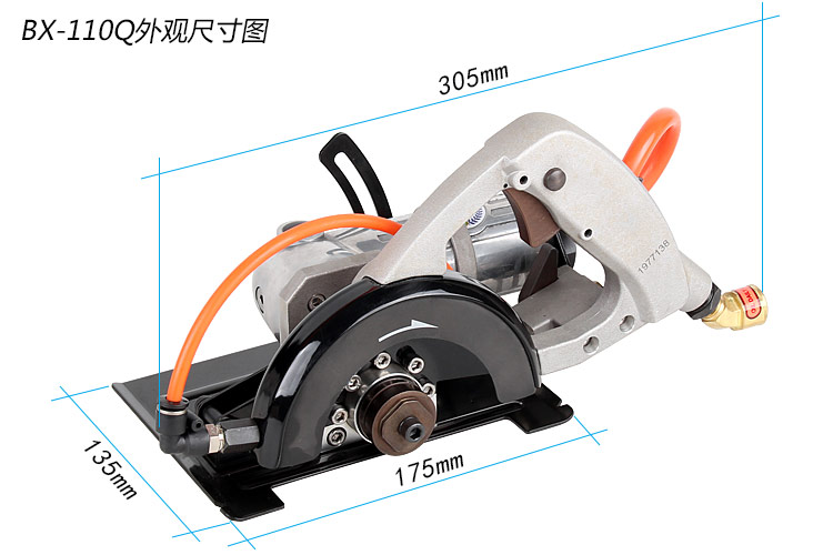 • 產(chǎn)品參數(shù): 產(chǎn) 品 型 號(hào):BX-110Q(側(cè)排氣) 切割片尺寸:114mm 切割片孔徑:20mm/22mm 最大切割深度:30mm 空 載 轉(zhuǎn) 速:6500rpm 馬 達(dá) 功 率:470W(0.63HP) 機(jī) 身 長 度:330mm 重 量:2.92kg 耗 氣 量:0.5立方米/分鐘 噪 音 值:85db 進(jìn) 氣 口:1/4" 推薦使用氣管:內(nèi)徑8mm 使用工作氣壓:0.63Mpa